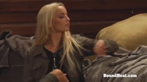 Sexy cuffed girl in restraints with big natural tits massages her pussy and ass with a huge cock